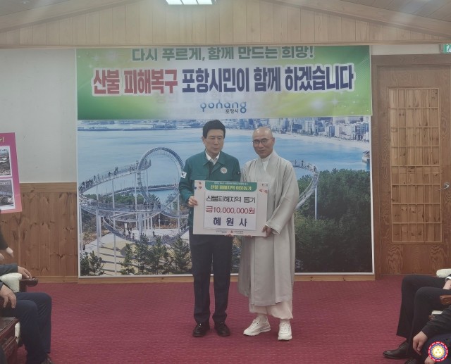 총 본산 칠보산 혜원사, 포항시에 산불피해복구 성금 1천만원 전달